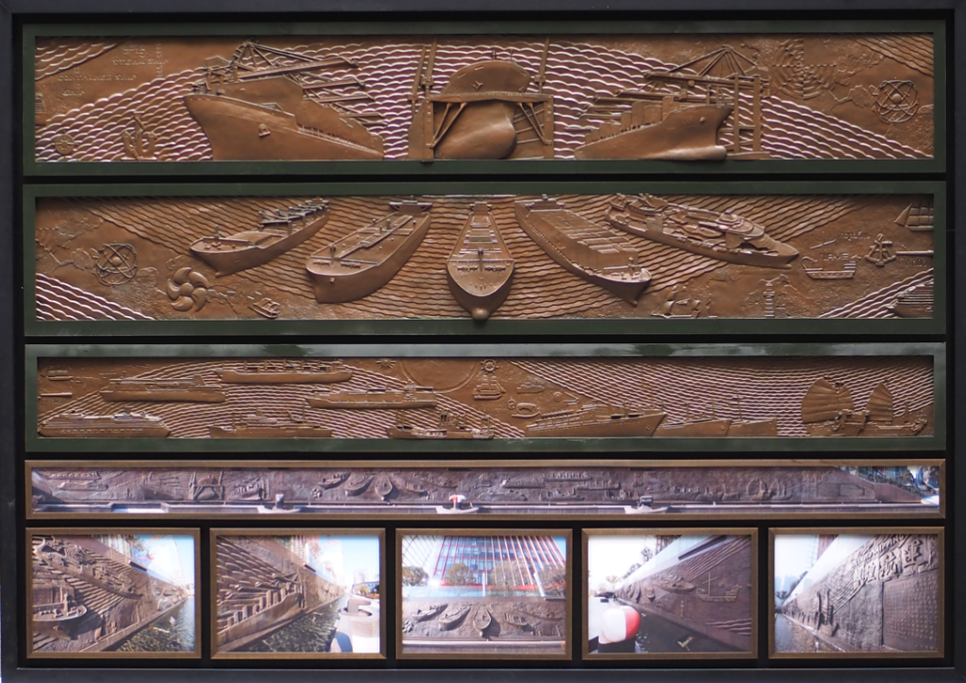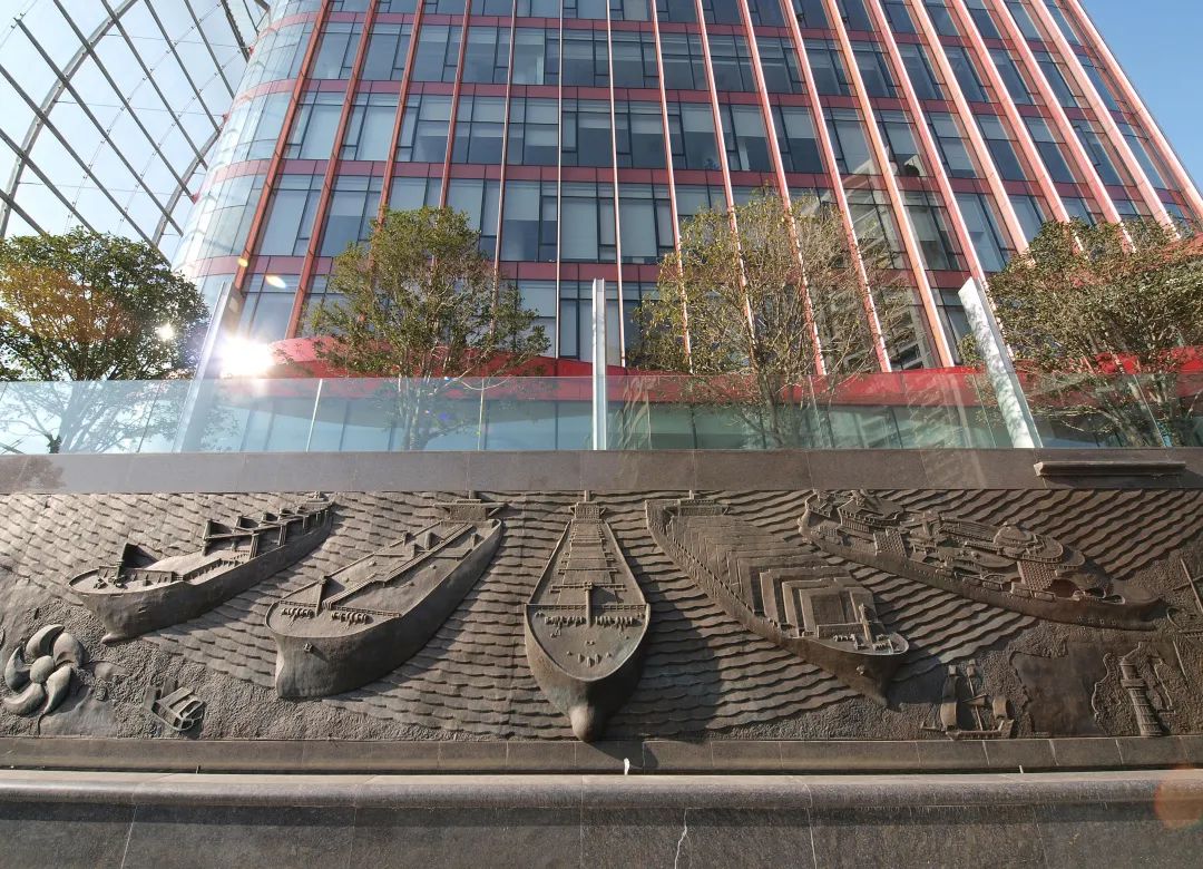 大型浮雕壁画《辉煌航运》建成作品位于上海市高阳路中国海运总部所在国客中心6号楼东侧,长67米,高2.5米,青铜铸造,重16吨。整个浮雕壁画气势宏大,刻画了从上海滩开埠时期的沙船、到蒸汽机船,直至现代大型集装箱船、超级邮轮和大型干散货船等,回顾了一百多年来中国航运事业的发展历程,展望国际航运中心的未来前景。在创作过程中采访了中国海运周天赐等退休老船长,希望让作品讲述上海航运的历史故事和新老码头的变迁。“辉煌航运”大型浮雕壁画的建成,为北外滩增添了新的地标,成为虹口区首个国家AAAA级景区上港邮轮城的重要景点,2022年被评为虹口区最佳微游线路:老码头穿越之旅的推荐打卡点。