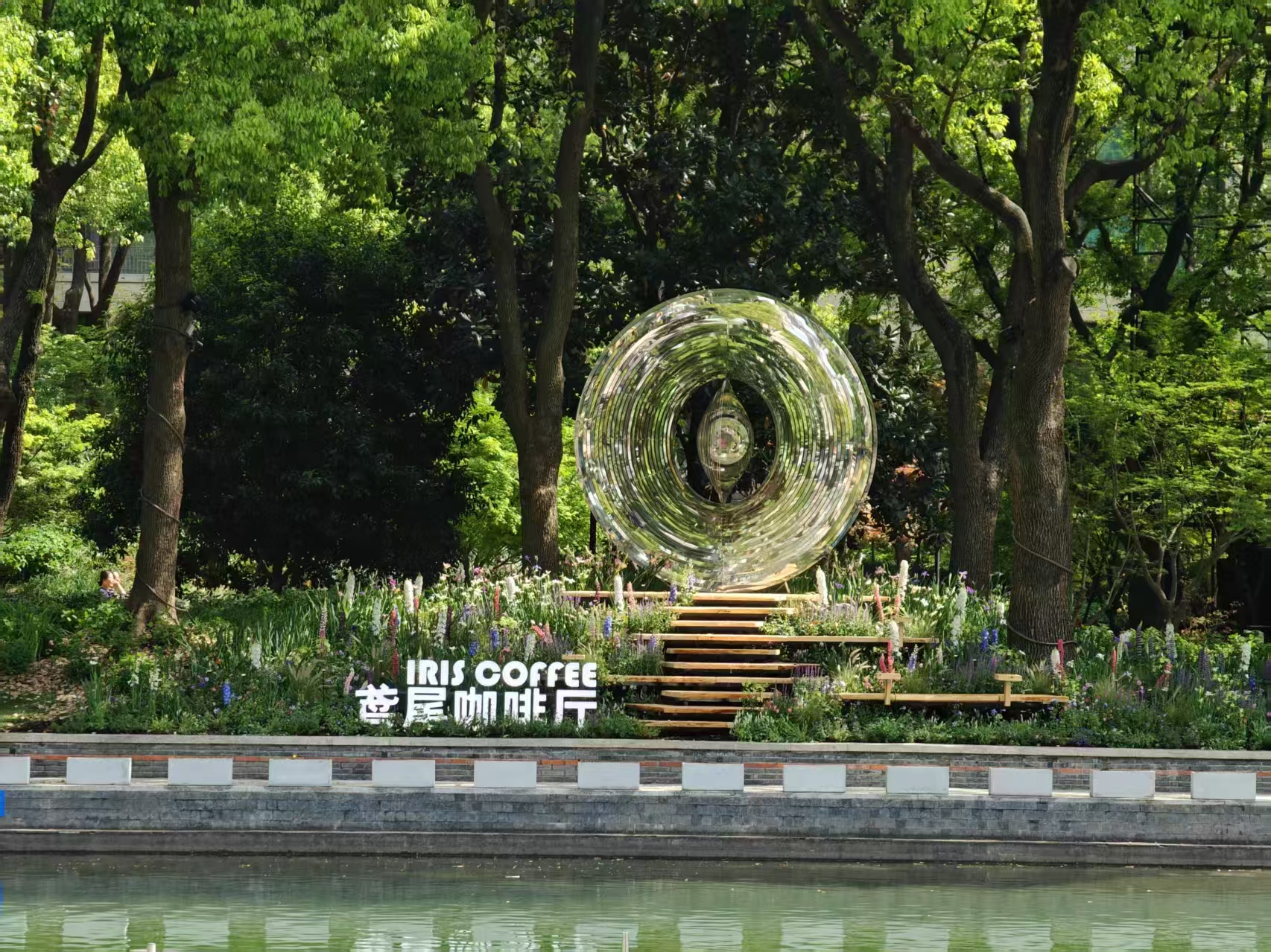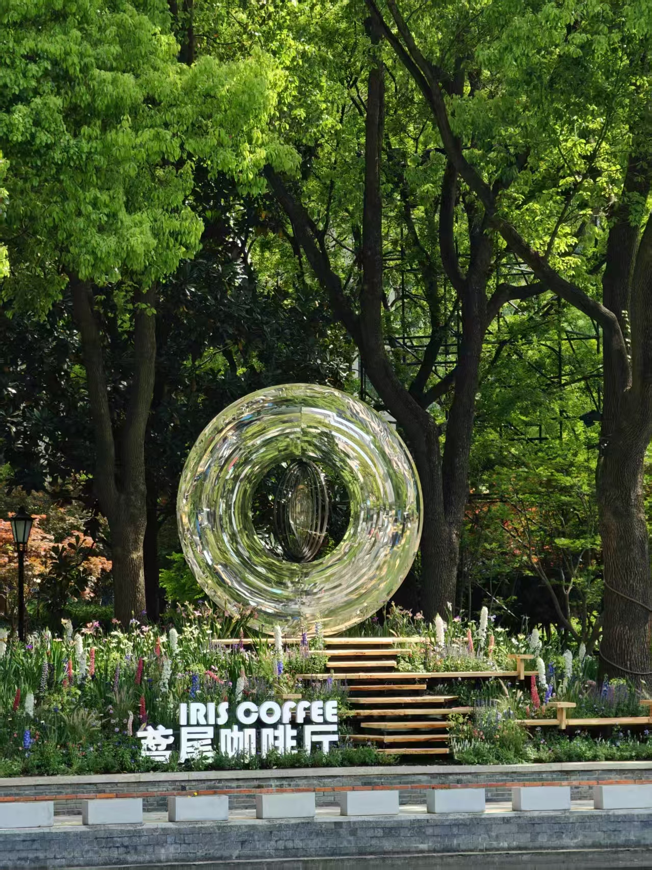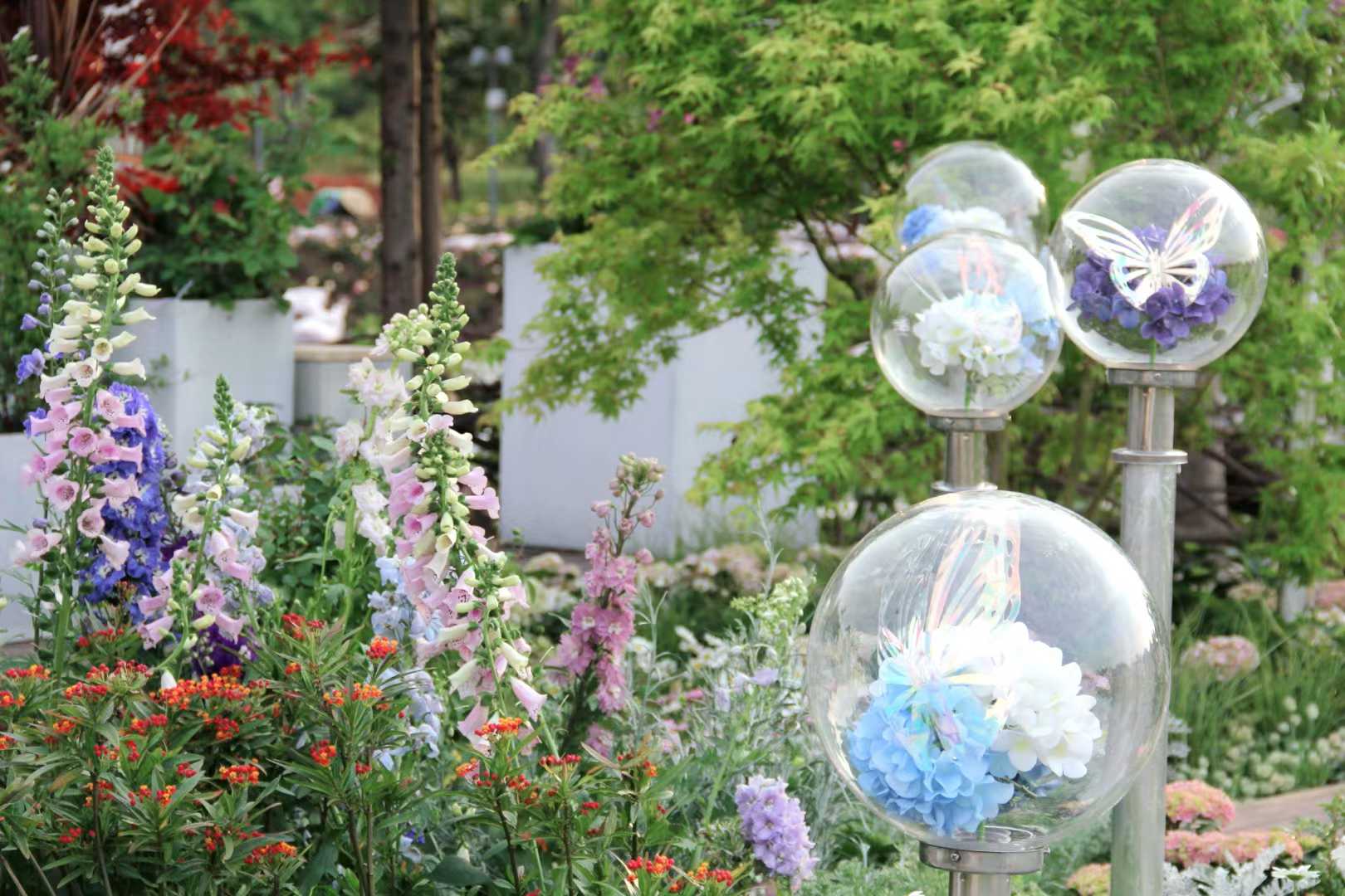 花园中央,一座名为“瞳”的大型旋转装置格外引人注目。它由镜面不锈钢打造而成,宛如一颗巨大的银色眼眸。当装置缓缓旋转,镜面清晰地映射出周围绚丽多彩的鸢尾花境,花影随着旋转流动、交织,形成如梦似幻的动态视觉效果,让人流连忘返。