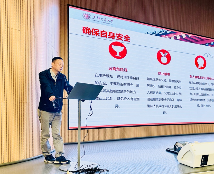 上海交通大学电气工程学院张明老师为师生开展用电安全培训。他结合真实案例,总结出用电安全的八字要领——“切断电源,保持镇定”,并围绕用电过程中的安全风险及其应对方案进行了系统讲解。