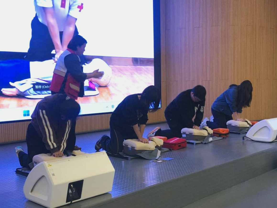 随后,培训进入实操性极强的急救技能演练环节。专业讲师系统讲解了心肺复苏(CPR)的操作流程、自动体外除颤器(AED)的使用方法以及常见外伤的应急包扎技术。在讲师指导下,同学们纷纷上手,利用模拟人教具认真练习胸外按压和人工呼吸,亲身体验了AED的操作步骤。