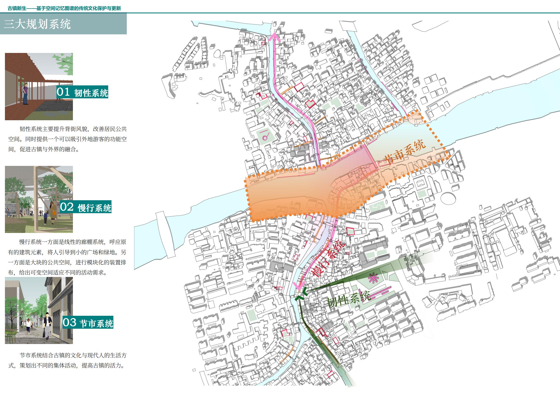 结合理论与实践基础,团队规划韧性、慢行、节市三大系统,吸引游客驻足、居民回归、文化活化,并展开典型空间设计,形成聚焦古镇传统文化保护与文商旅融合发展的系统方案和可复制路径。