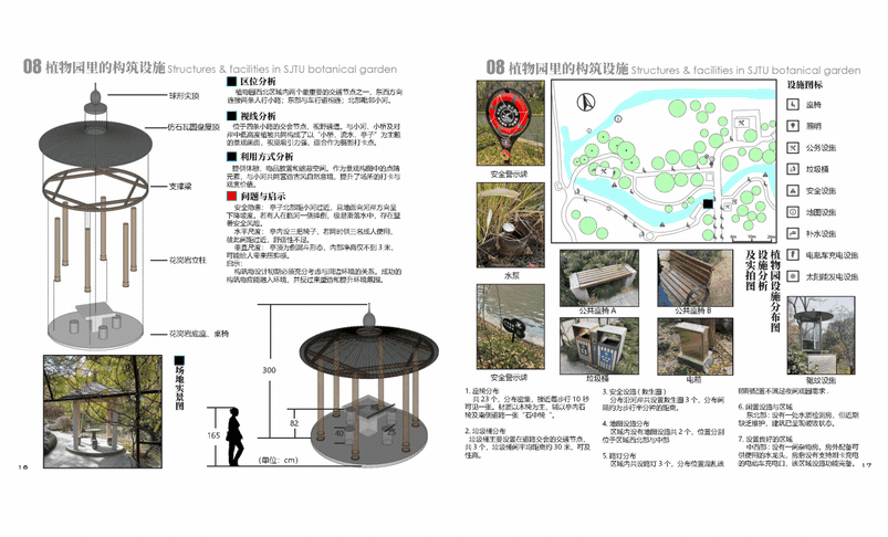 该主题主要训练构筑物与小品的调研分类、优化分析及图示化表达,以小组为单位对上海交通大学植物园的设施(构筑物与小品)进行分布、状态的分类调研,分析其使用中的可优化点与可借鉴之处,了解植物园运营背后“看不见”的安全保障和基础设施。
