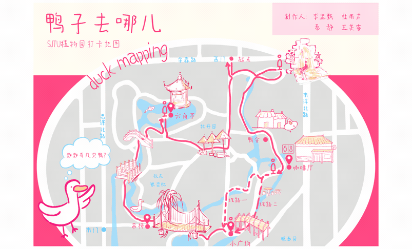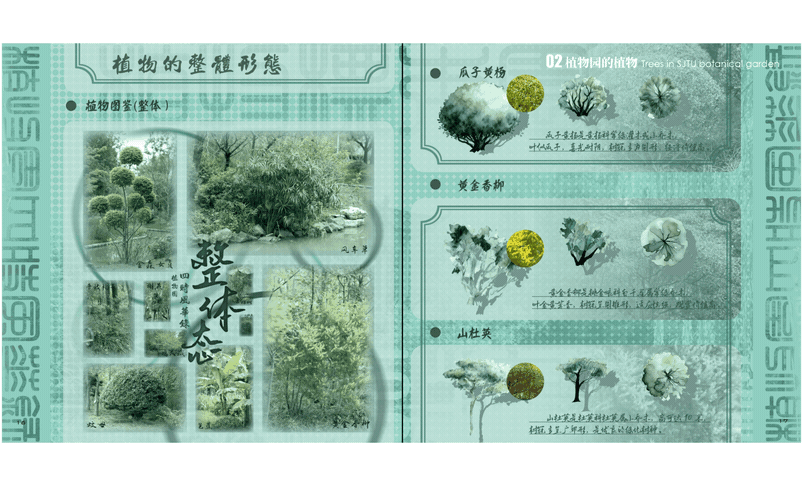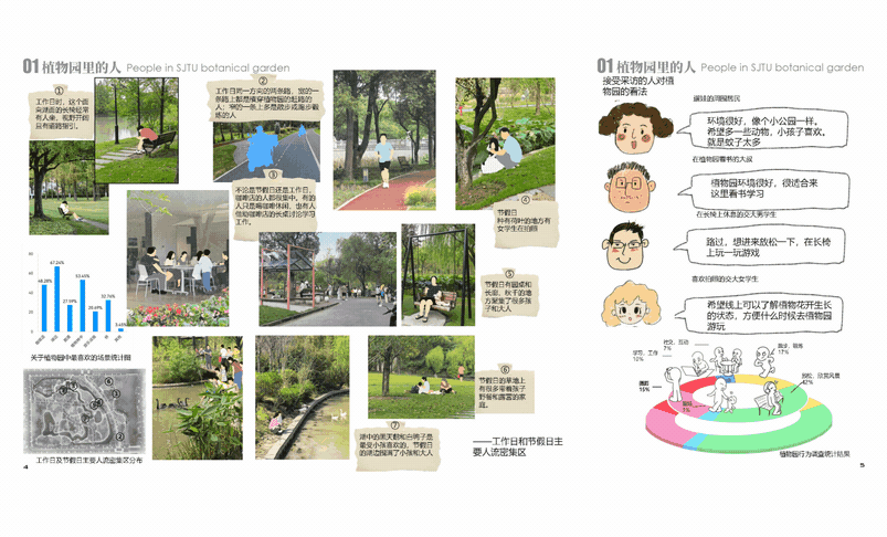 该主题主要是基于人的需求与行为的调研方法实践及环境信息可视化表达,通过问卷、访谈、流线跟踪等多元调研方法,调查上海交通大学植物园的人流分布、使用需求和行为特征,最终完成相关数据图文可视化成果。