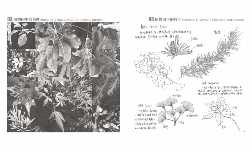 该主题主要训练乔灌地被类景观植物的形态特征认知、分类辨识及图示化表达,通过观察校园常见乔灌木及其群落,认知其宏观形态、观赏性特征、植物类群差异和植物景观群落特征,掌握平立面绘制技巧与景观配置要点,提升植物景观设计表达能力,同时掌握不同类型植物的基本形态特征。