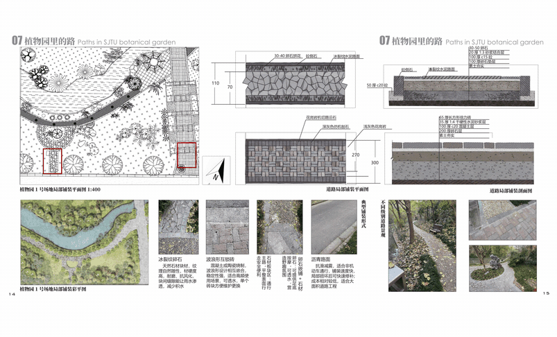 该主题主要训练场地铺装与道路的测绘调查、材料识别及规范图面表达。运用测绘工具记录场地铺装的类型、材质、尺寸及道路参数,识别不同铺装材料的特性与适用场景,通过平面、剖面及节点绘制完成铺装与道路的规范图面表达。