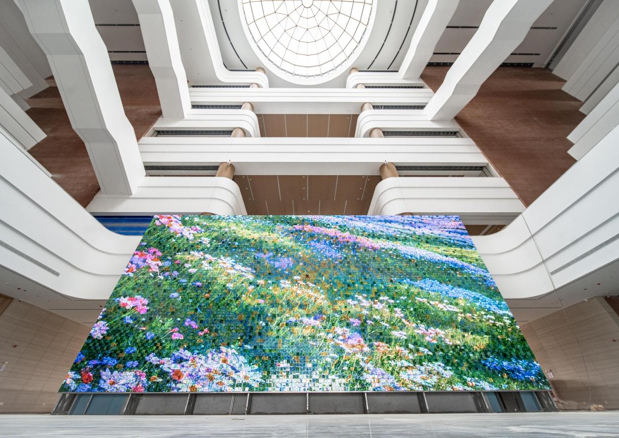 作品落地于福耀科技大学,创新融合福耀玻璃技术与古法琉璃文化。作品从中华优秀传统文化传说、典籍汲取思想,展现变化与恒常、幻境与实相、外秀与内藏;作品延续“火里来,水里去”的传统工艺特质,外置古法手作七彩琉璃,内置前沿数字显示科技。作品将不同颜色、不同厚度、不同纹样的古法琉璃莲花,交错安装,形成一件大型艺术装置作品。背后 LED 屏幕由前沿数字技术进行智能交互,自动生成各种绚丽画面,图像透过古法琉璃更显深邃神秘。
