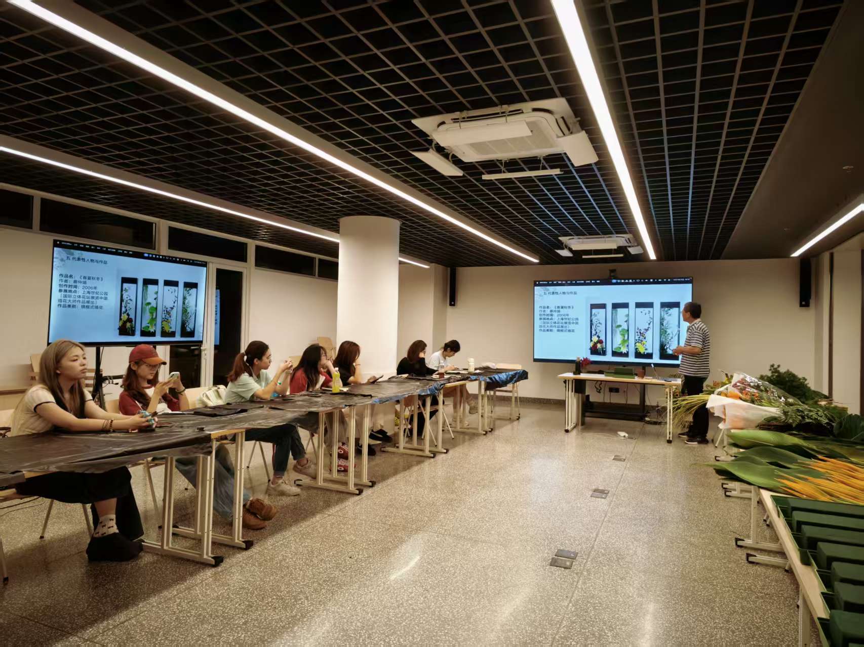 比赛前夕,风景园林系特邀海派非遗插花传承人陈佳瀛副教授对参赛学生进行内训,从海派插花花艺的构架手法等方面进行演示教学,传授海派插花花艺特点和材料的多元表达手法。同学们积极投入学习实践,深情领悟插花花艺的精髓。